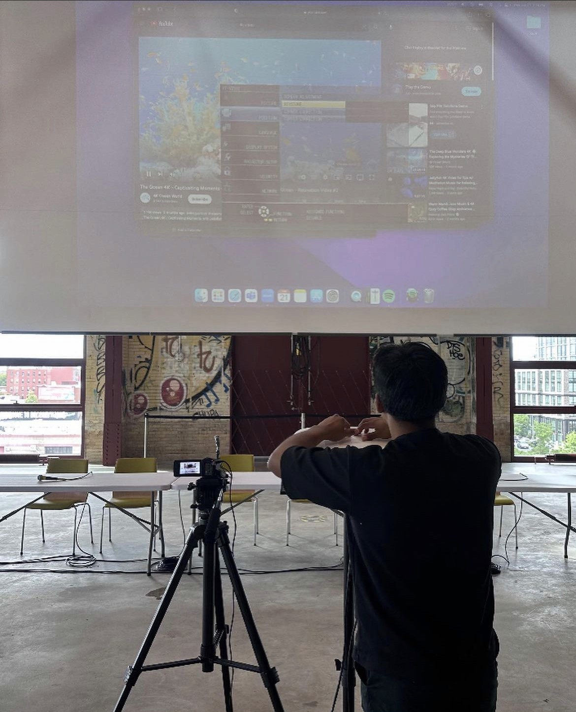 The setup for this event required meticulous planning and coordination. Our first step was to scout the Powerhouse Arts studio, identifying the optimal placement for the projector and ensuring all cable runs and camera runs are measured to bring the proper length of SDI's for the day of the meeting. The choice of projector was critical, aiming for a model that offered high brightness and clarity to provide good visibility of the contents on screen in a bright room.